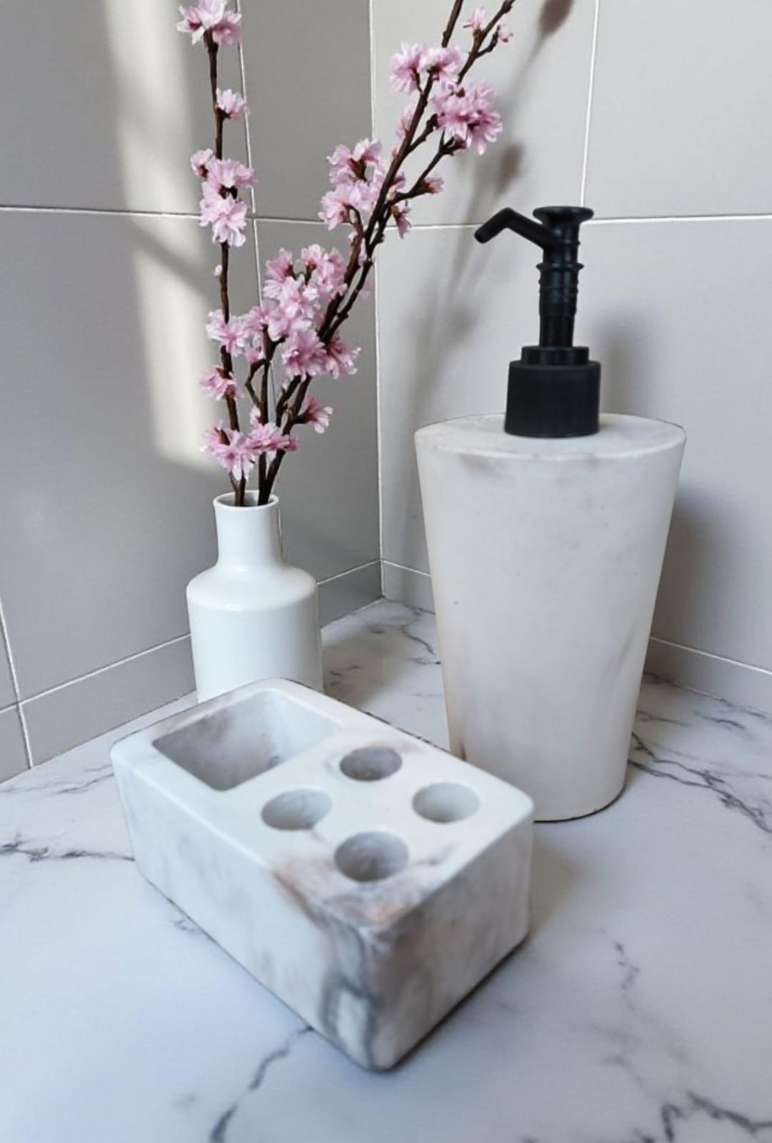 Dispener y portacepillos realizados en cemento y marmolina. 100% artesanales.