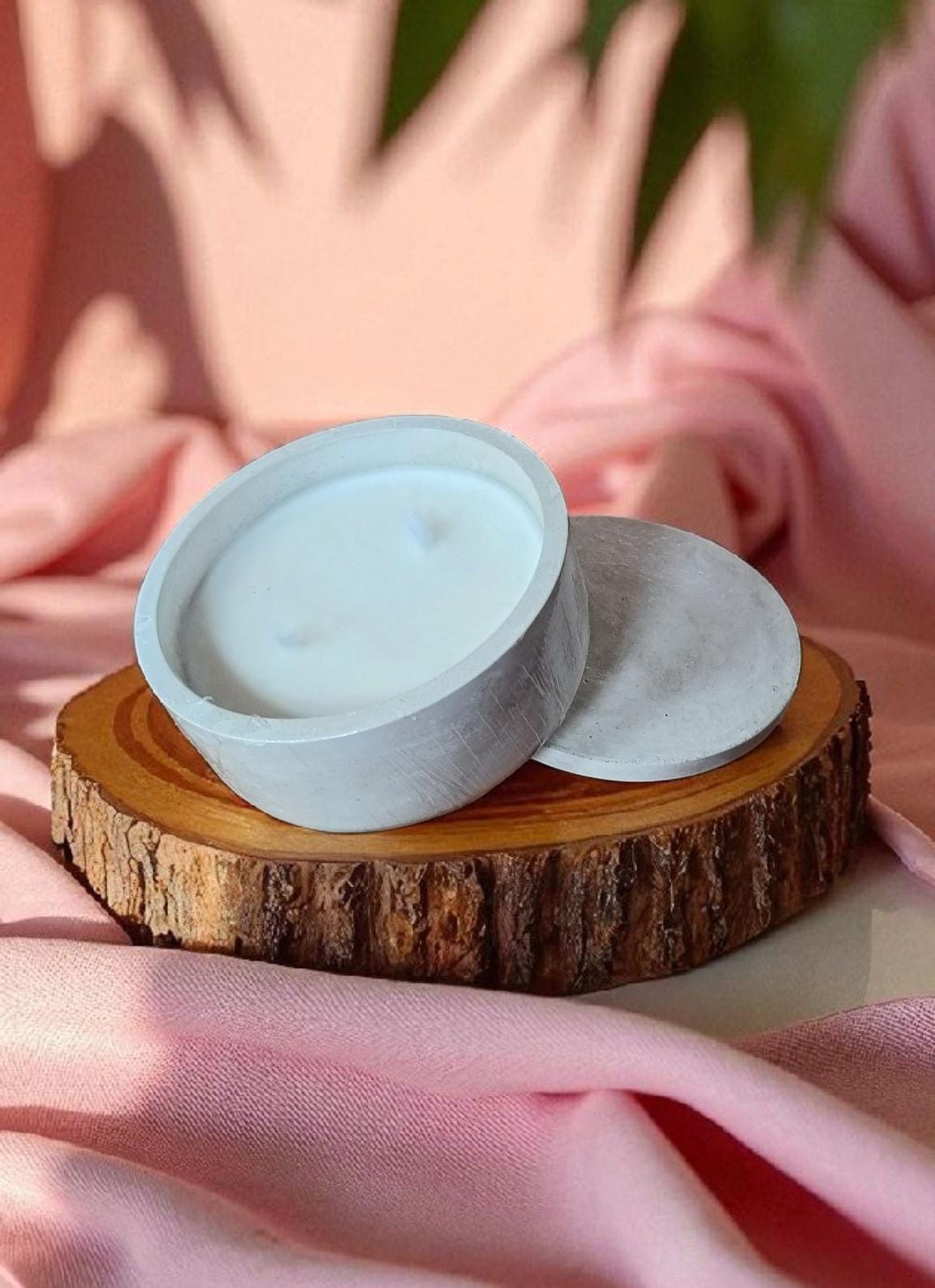 Cuenco circular con tapa, realizado en cemento y marmolina. Vela de soja en su interior, aroma a maderas orientales. 100% artesanal
