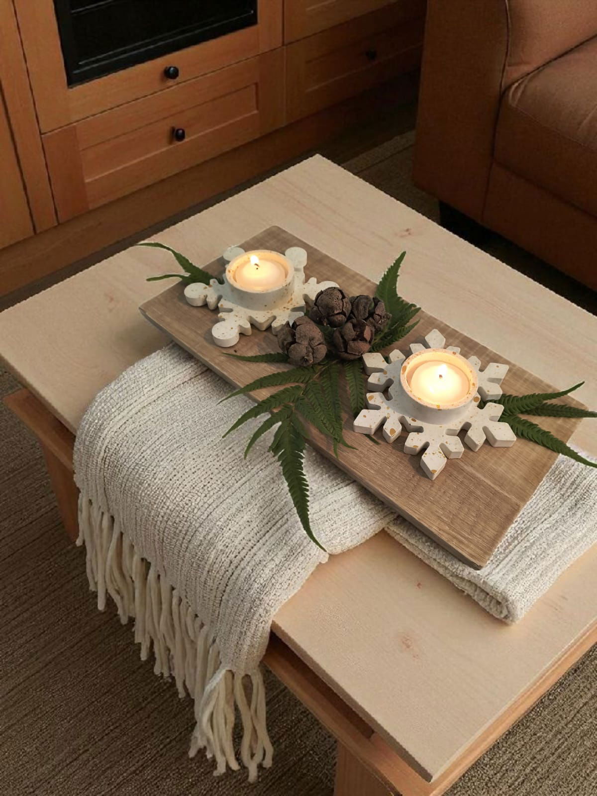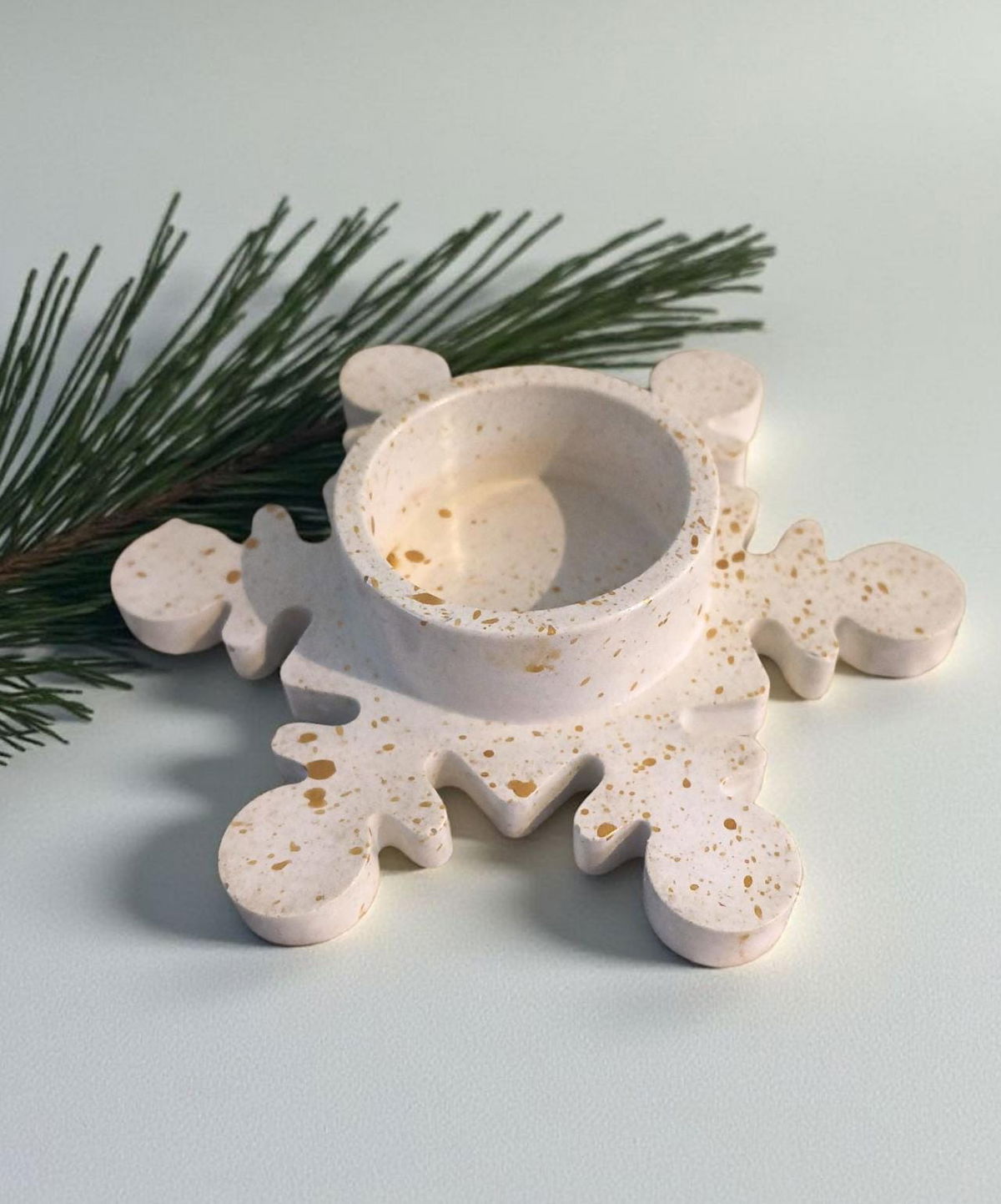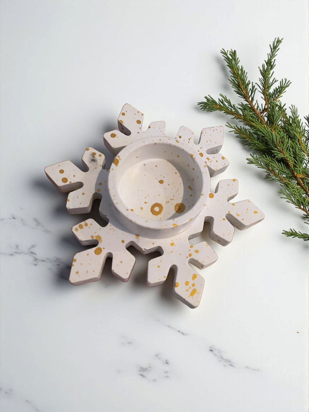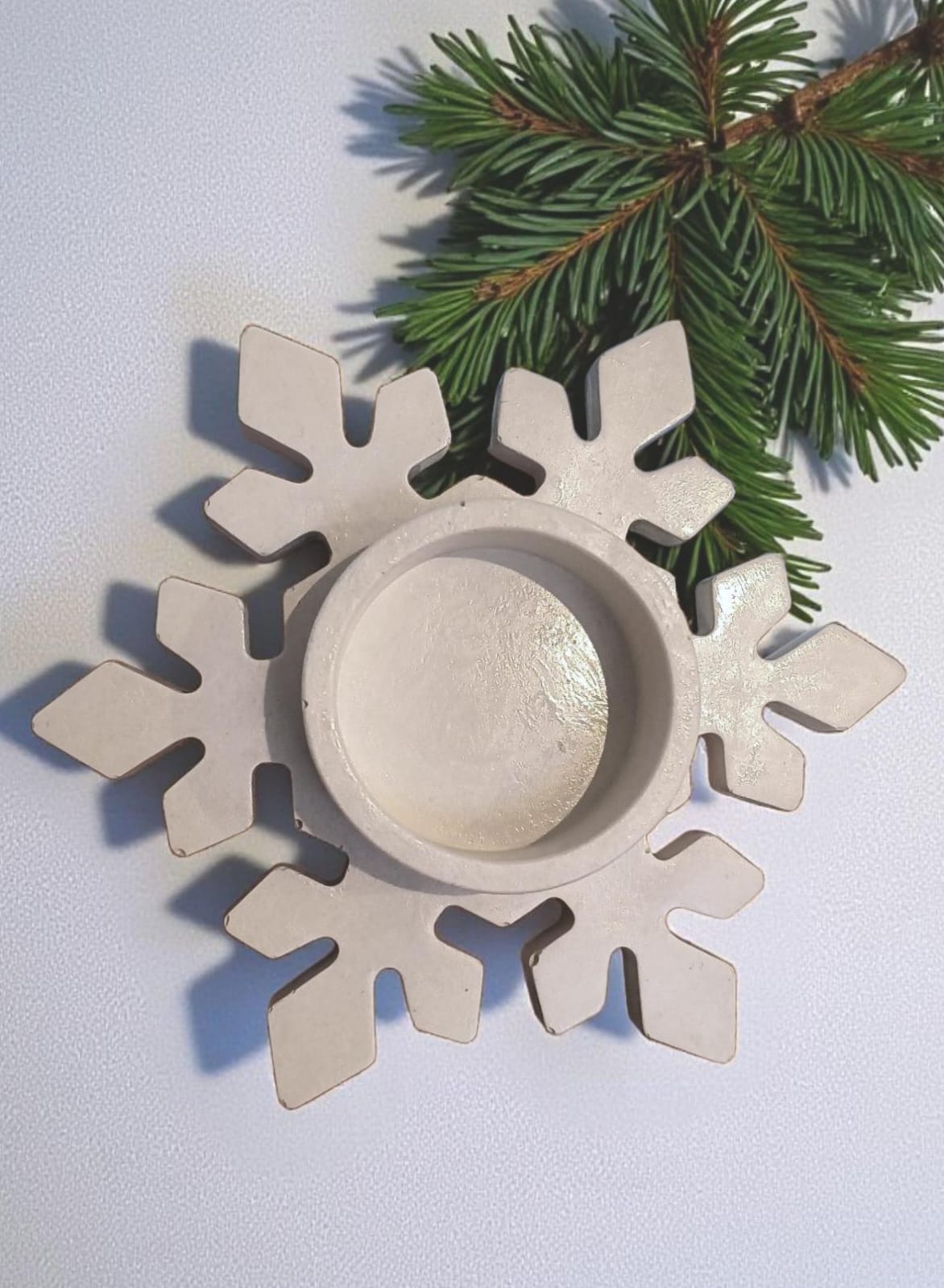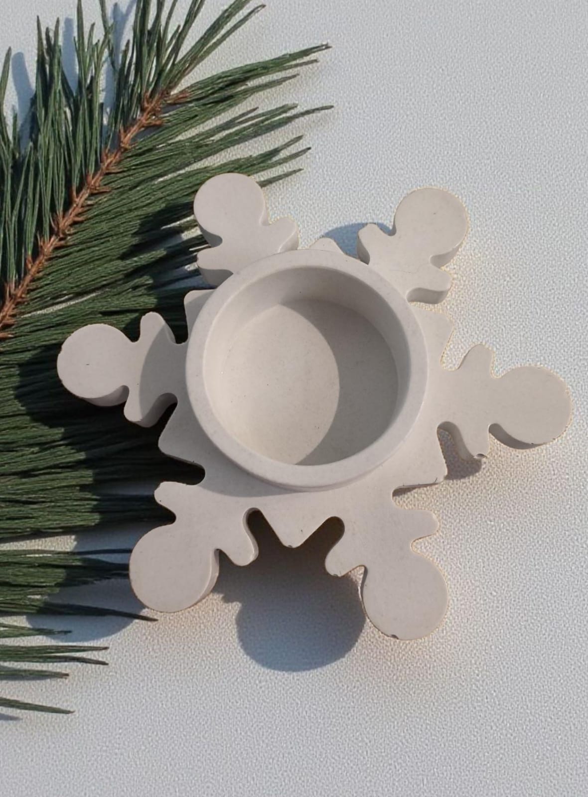 Candelabros con forma de copos de nieve, realizados en cemento y marmolina. 100% artesanal.