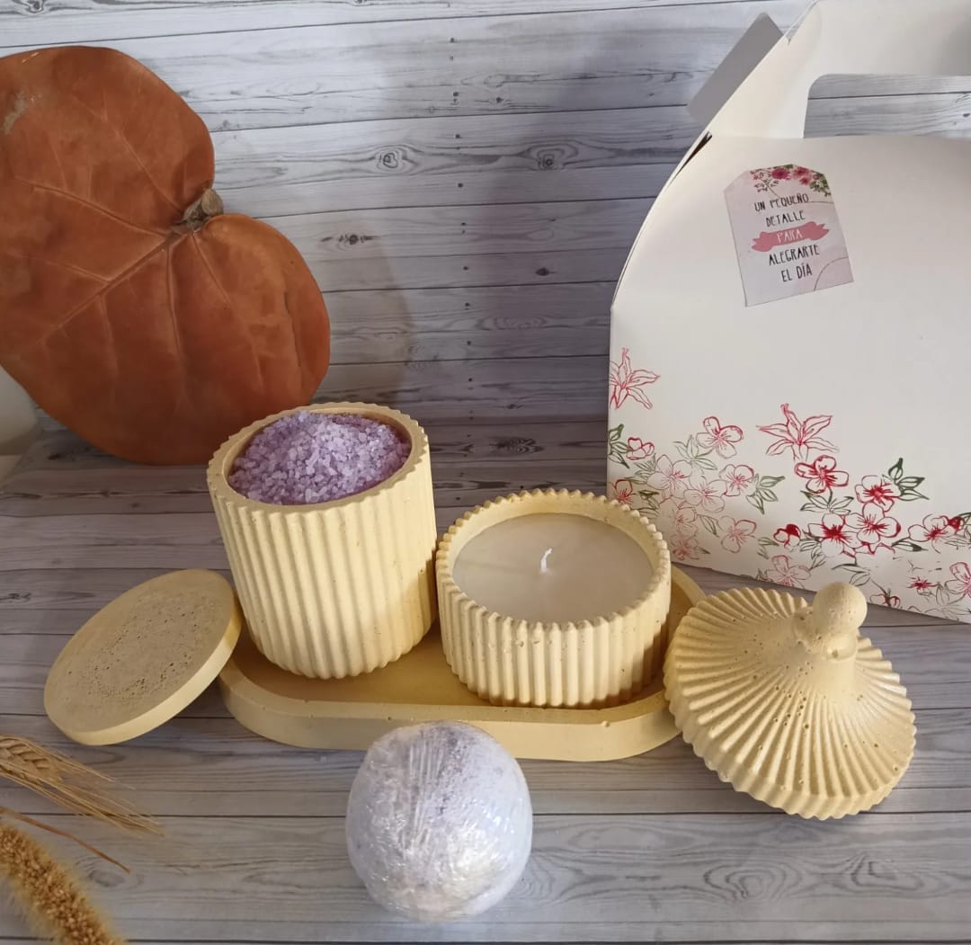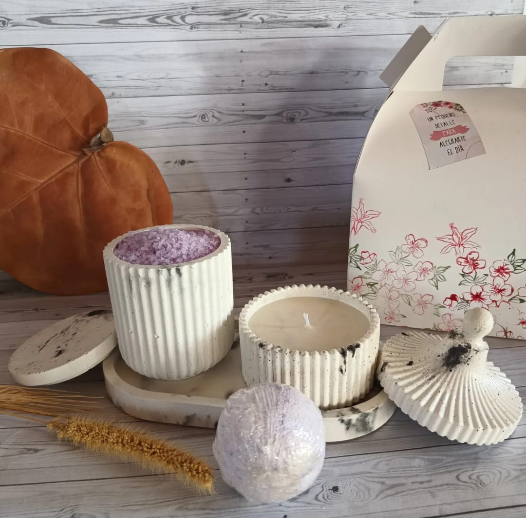 El set spa incluye: una bandeja oval, un alhajero circus con vela, un alhajero ondas con sales de baño y dos bombas de baño aromáticas. 100% artesanal.
